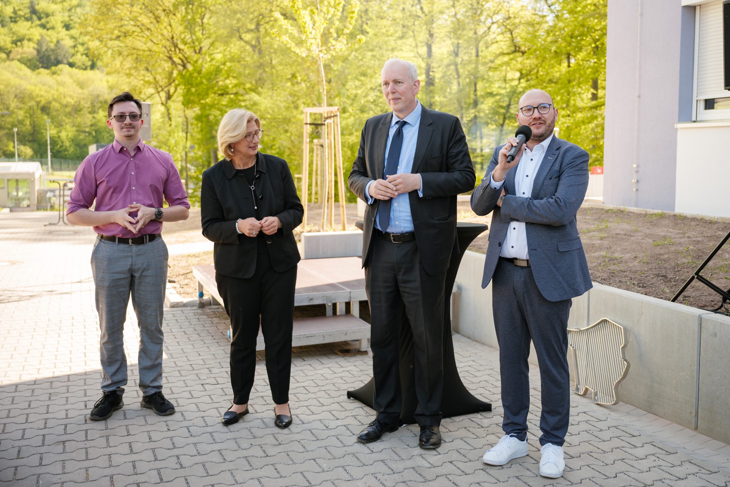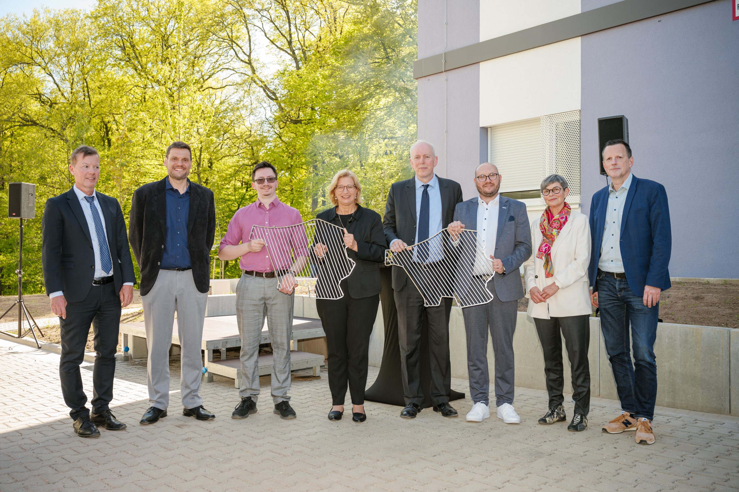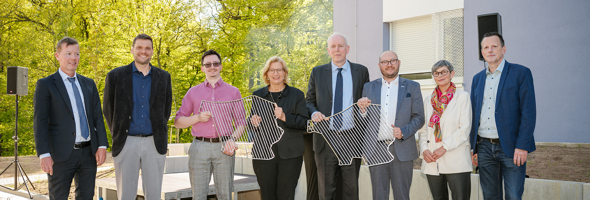 Ein halbes Jahr früher als geplant haben bereits die ersten Studierenden ihre Apartments in einem der drei neuen Studierendenwohnhäuser am Universitätscampus in Saarbrücken bezogen. Zur Begrüßung der neuen Bewohnerinnen und Bewohner lud das Ministerium der Finanzen und für Wissenschaft gemeinsam mit der WOGE Saar am 24. April zum Grillnachmittag ein. Die Veranstaltung markierte zugleich die offizielle Eröffnung der Studierendenwohnhäuser mit insgesamt 234 Wohnplätzen auf dem Campus. Auch die Ministerpräsidentin Anke Rehlinger war vor Ort und hieß die Anwesenden persönlich willkommen. Zusammen mit dem Wissenschaftsminister Jakob von Weizsäcker und dem Geschäftsführer der WOGE Saar Mirco Bertucci eröffnete sie die Veranstaltung mit einem kurzen Grußwort.